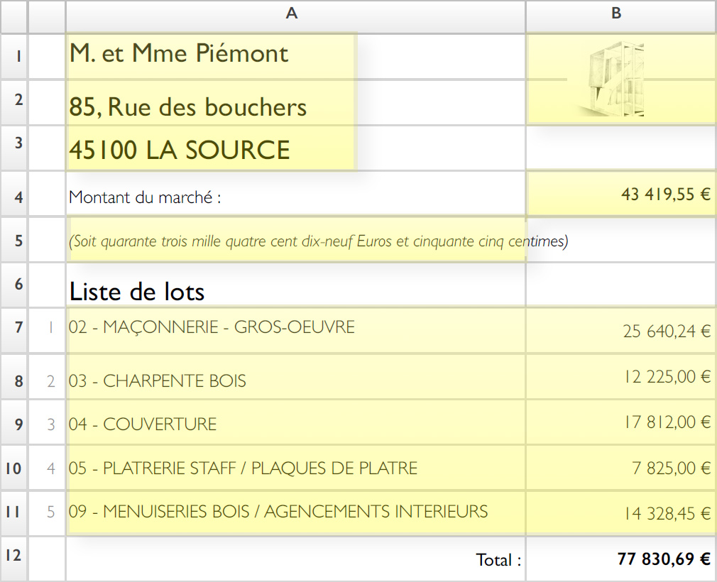 Complétez ce coût de la construction par des saisies manuelles ou des formules de calculs pour les frais d’acquisition du terrain et d’assurances, les taxes…, et obtenez un coût total fiable selon l’avancement de vos études.