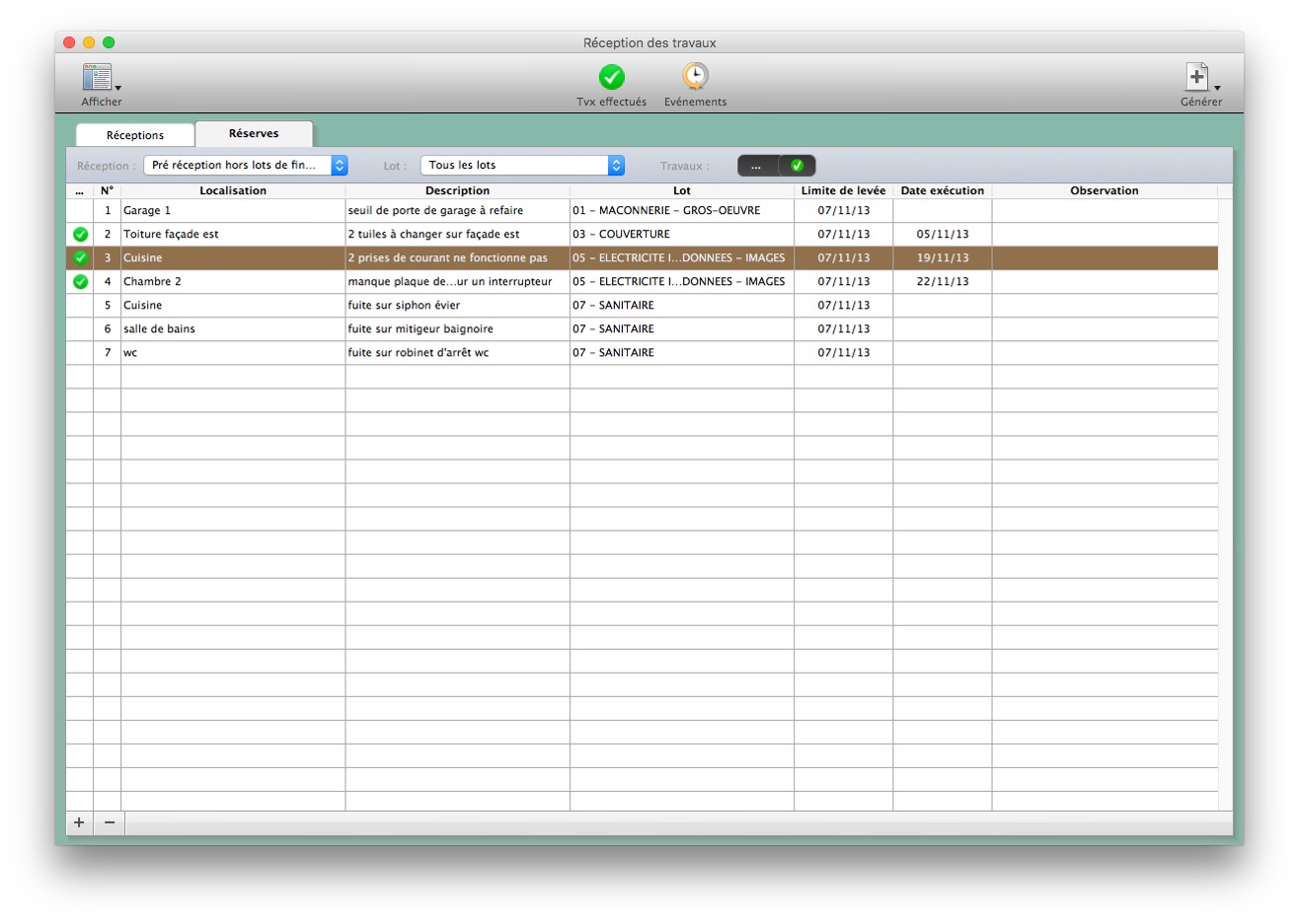 Avec BIMoffice, vous gérez différents types de réception au sein d’un même projet (globale, par lot, par appartement…) et produisez tous les documents nécessaires : convocations des parties, états des réserves, rappels, quitus… Toujours en relation intime avec l’ensemble des données du projets que sont l’annuaire de projet, la comptabilité et le planning des travaux.